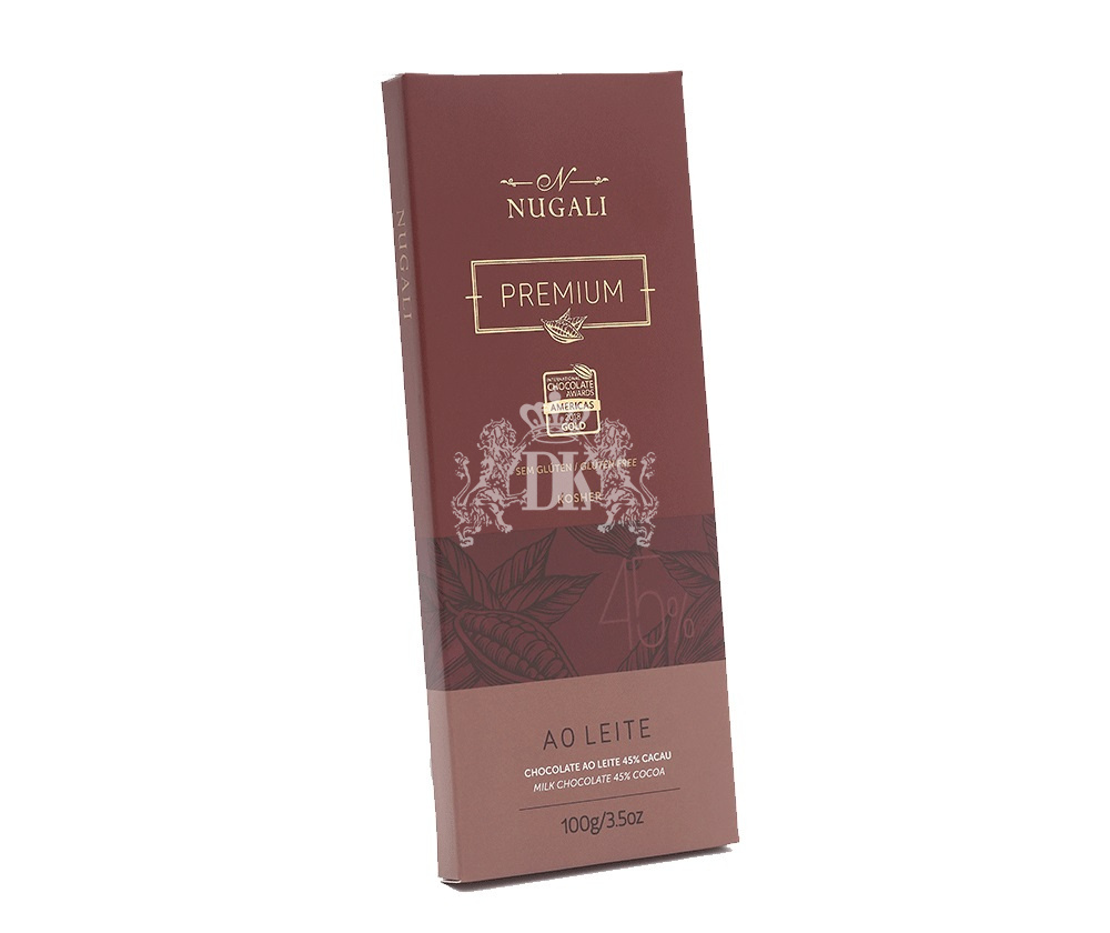 Eleito o melhor chocolate ao leite das Américas, o chocolate ao leite 45% cacau da Nugali, é formulado com um blend suave de cacaus, a mais pura manteiga de cacau e leite integral. Com menos açúcar, é um chocolate fino, macio e pouco doce.