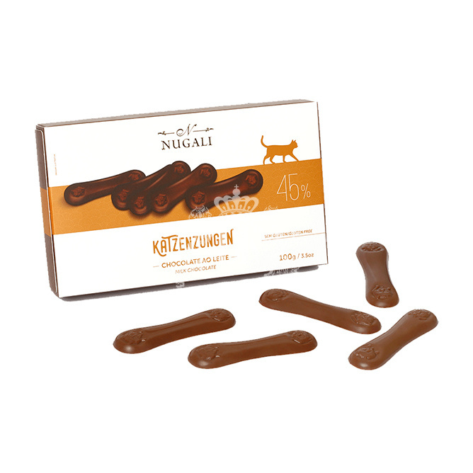 O melhor chocolate ao leite das Américas, em um formato perfeito para agradar a todos os gostos e idades. Criadas na Áustria, as Katzenzungen tem o tamanho ideal para degustação ou para a alegria dos pequenos chocolatiers. Tradicionalmente Chamado de Lingua de Gato.