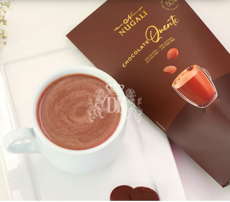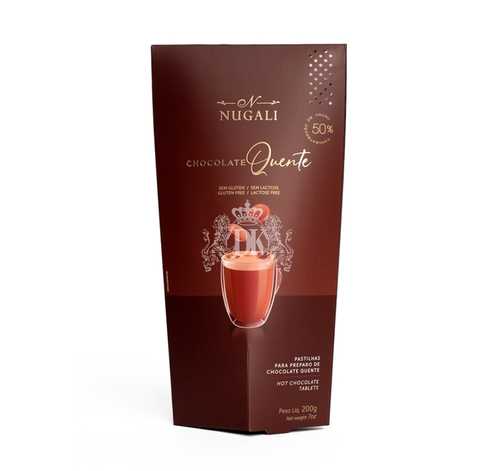 Feito com o mais puro chocolate Nugali, sem glúten, sem soja e sem lactose. Feito apenas com ingredientes naturais, sem conservantes, corantes ou aromatizantes artificiais. Certificado Kosher. Coloque de 8 a 10 pastilhas em uma xícara ou copo. Acrescente leite quente e mexa durante 1 minuto. Se desejar, utilize um mixer para mais espuma. Acrescente canela a gosto ou uma pitada de anis.