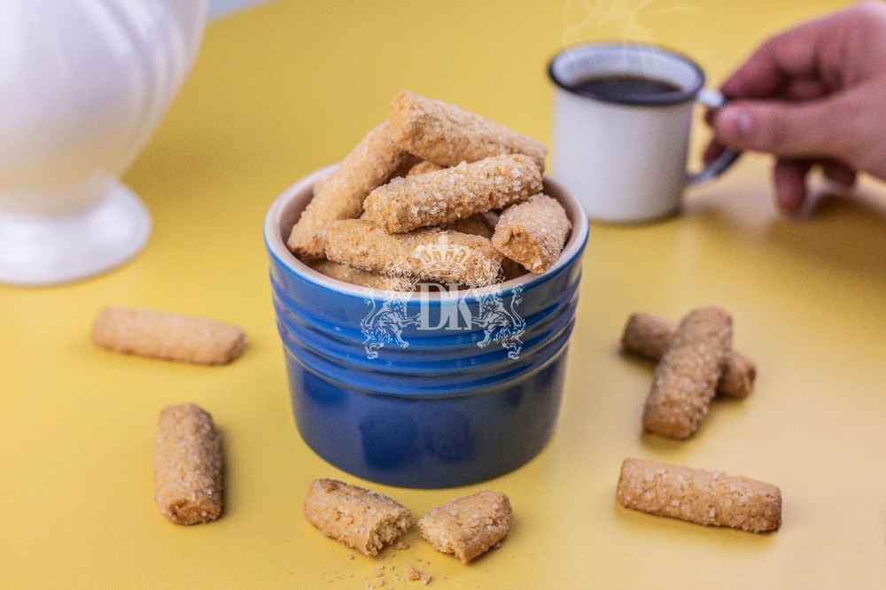 Um delicioso amanteigado de coco, coberto de açúcar cristal que deixa a bolacha ainda mais crocante.