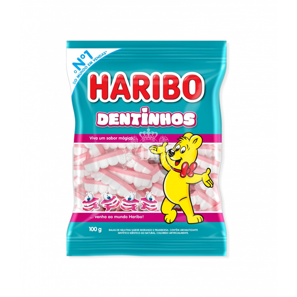 Balas de goma sortidas sabor morango e framboesa e em formato de dentinhos. Embalagem de 100g com 20 unidades em média.